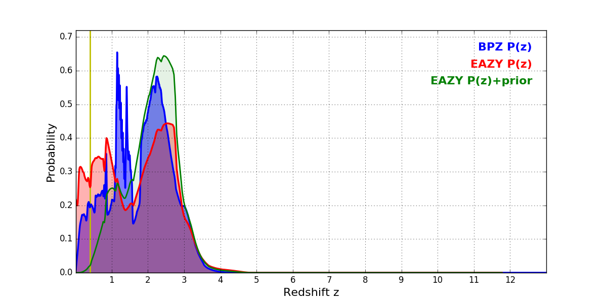 In P(z) plots: Yellow lines mark the cluster redshift z = 0.396,