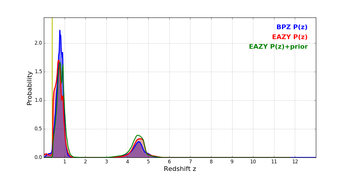 In P(z) plots: Yellow lines mark the cluster redshift z = 0.396,