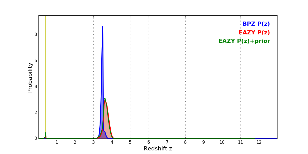 In P(z) plots: Yellow lines mark the cluster redshift z = 0.396,