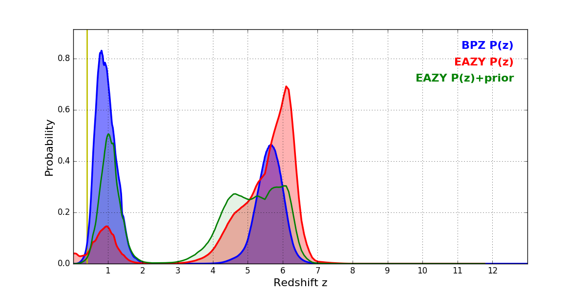 In P(z) plots: Yellow lines mark the cluster redshift z = 0.396,