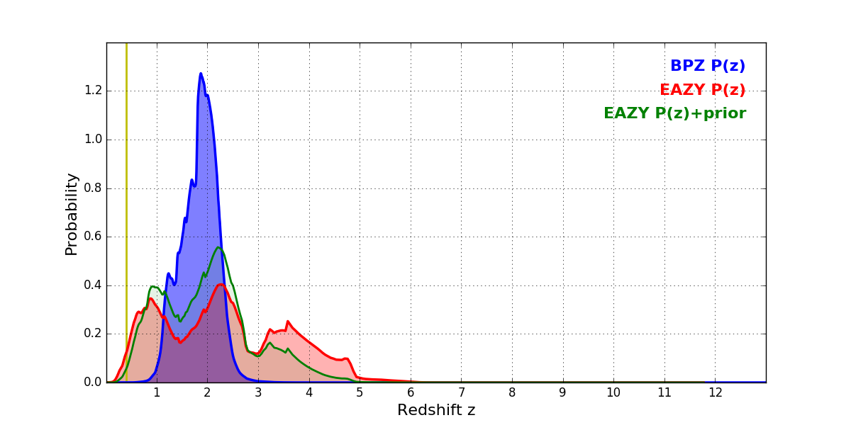 In P(z) plots: Yellow lines mark the cluster redshift z = 0.396,
