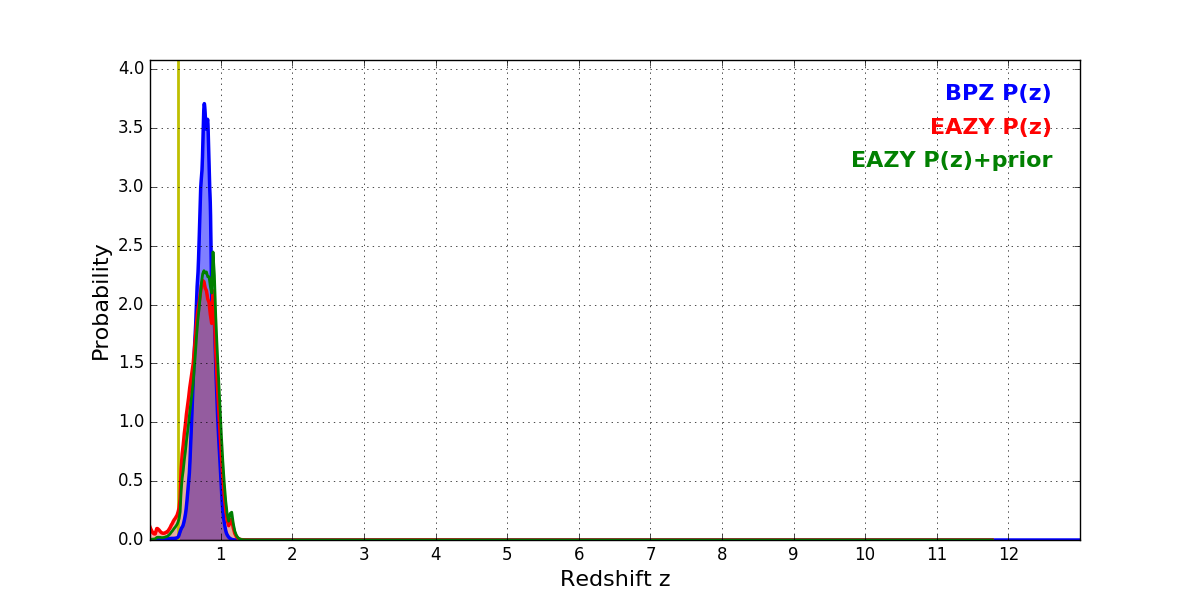 In P(z) plots: Yellow lines mark the cluster redshift z = 0.396,