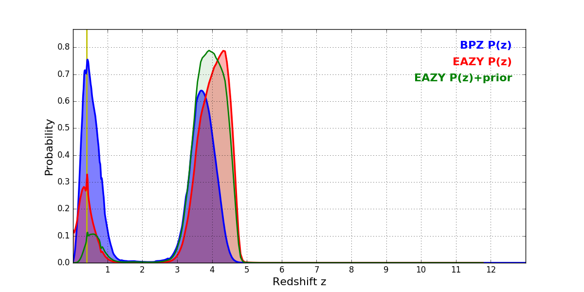 In P(z) plots: Yellow lines mark the cluster redshift z = 0.396,