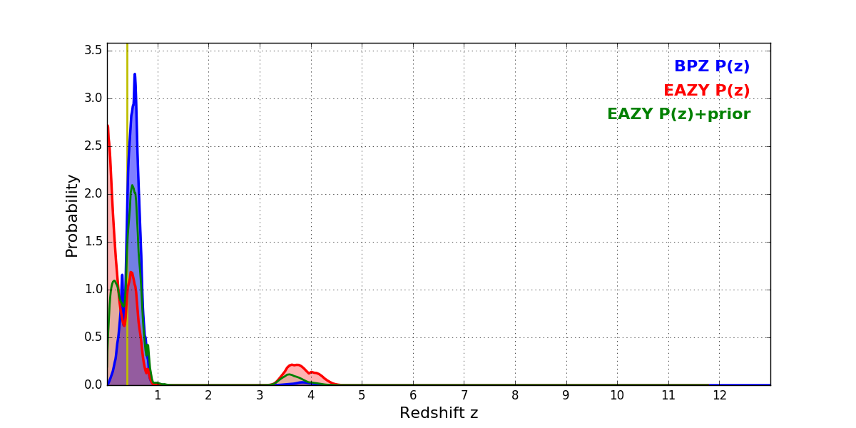 In P(z) plots: Yellow lines mark the cluster redshift z = 0.396,
