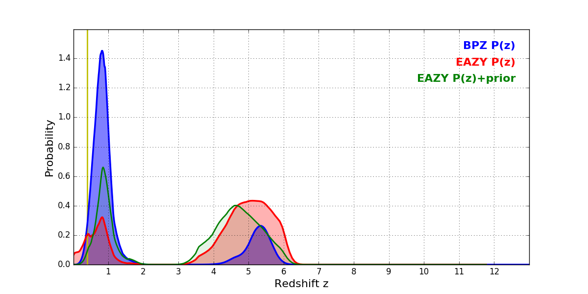 In P(z) plots: Yellow lines mark the cluster redshift z = 0.396,