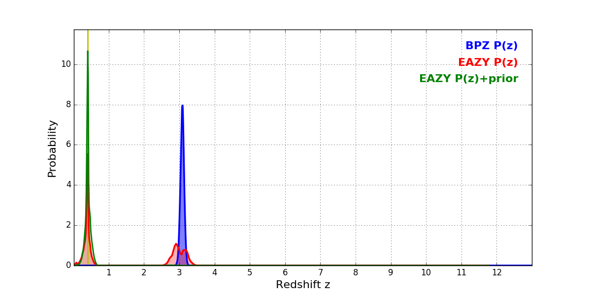 In P(z) plots: Yellow lines mark the cluster redshift z = 0.396,