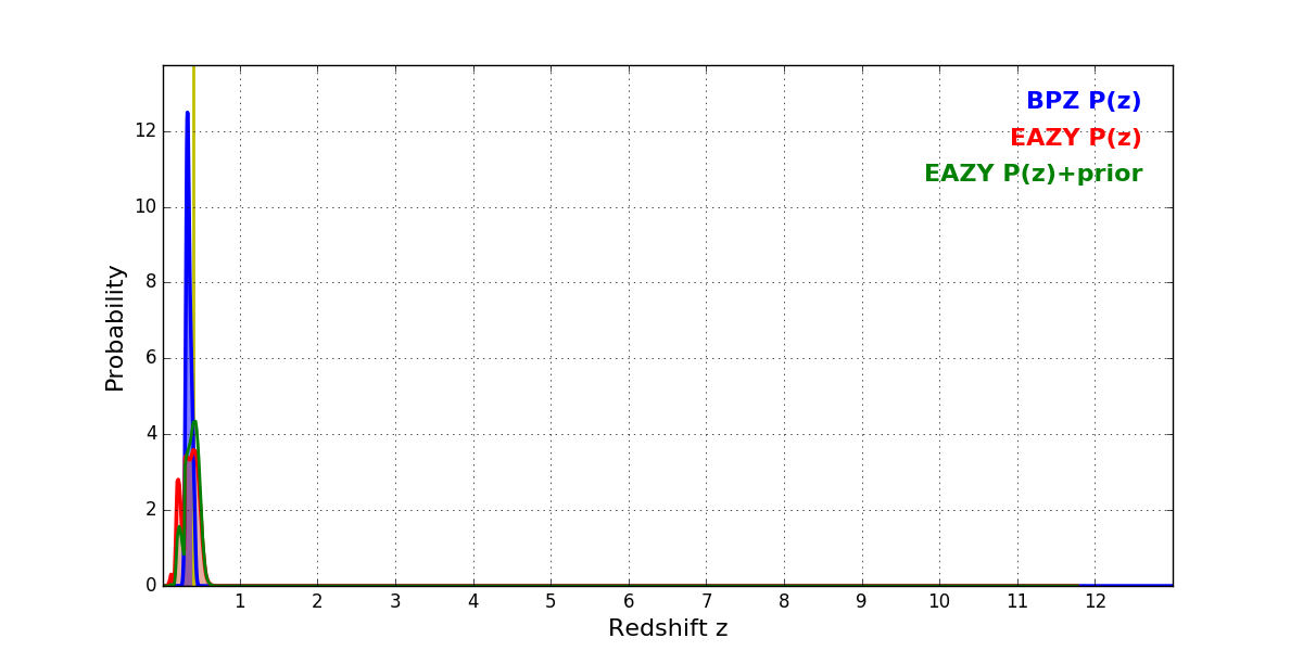 In P(z) plots: Yellow lines mark the cluster redshift z = 0.396,