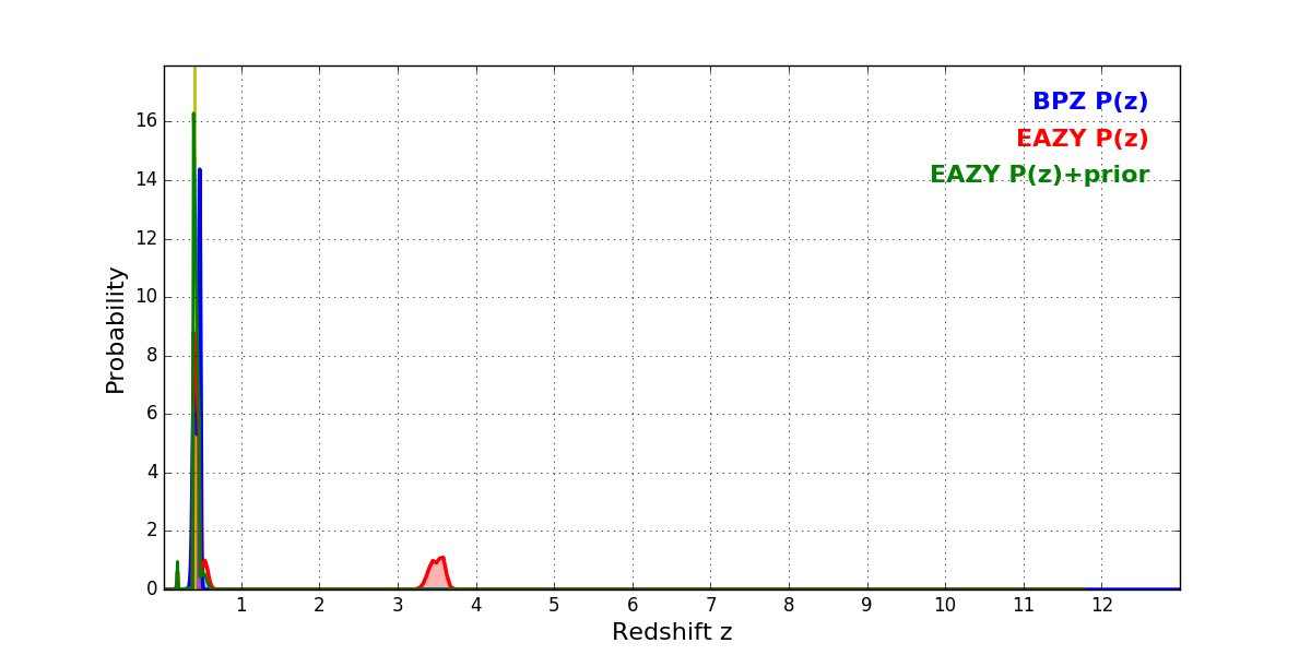 In P(z) plots: Yellow lines mark the cluster redshift z = 0.396,