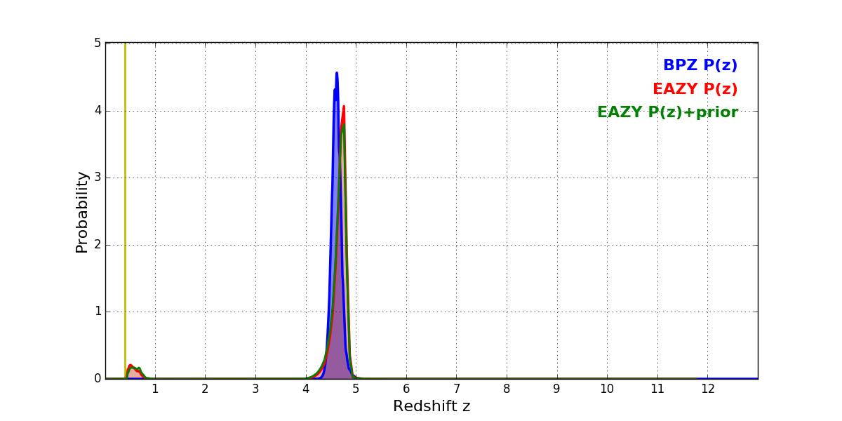 In P(z) plots: Yellow lines mark the cluster redshift z = 0.396,
