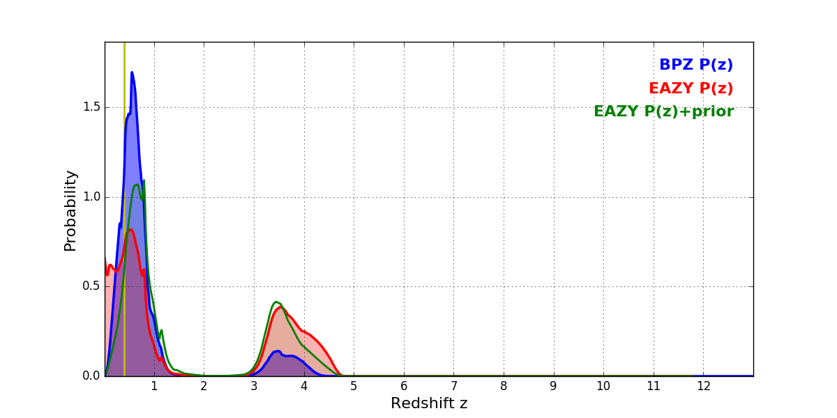 In P(z) plots: Yellow lines mark the cluster redshift z = 0.396,