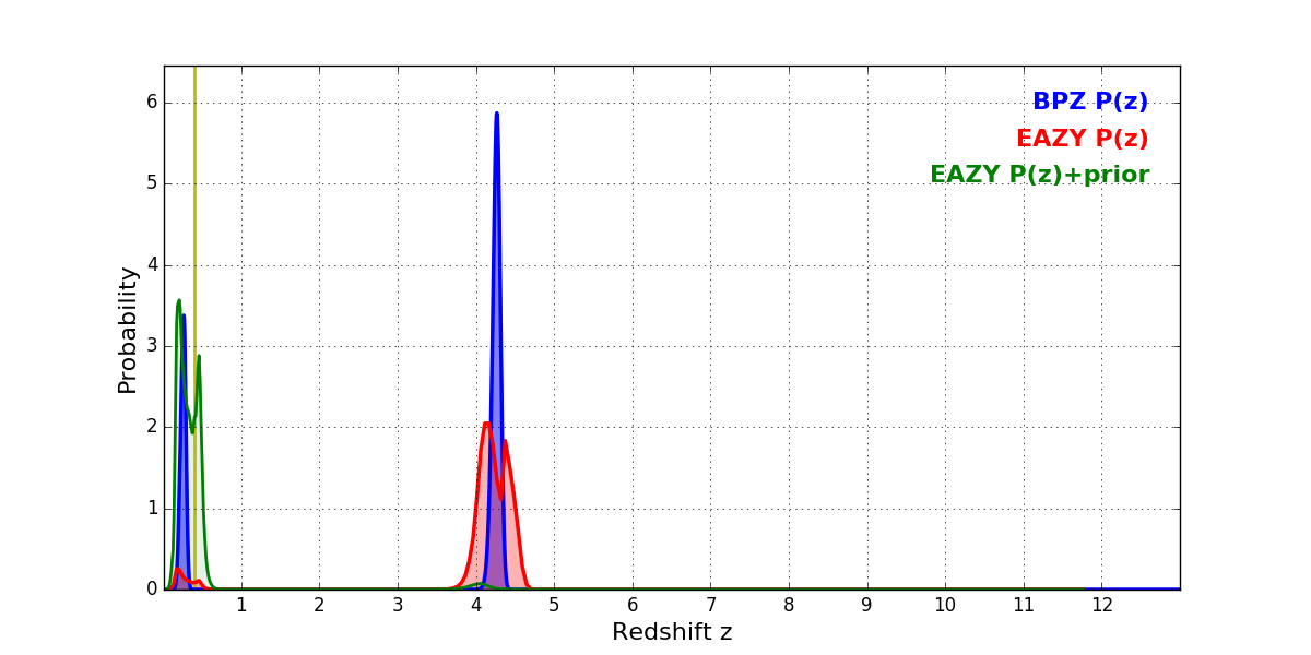 In P(z) plots: Yellow lines mark the cluster redshift z = 0.396,