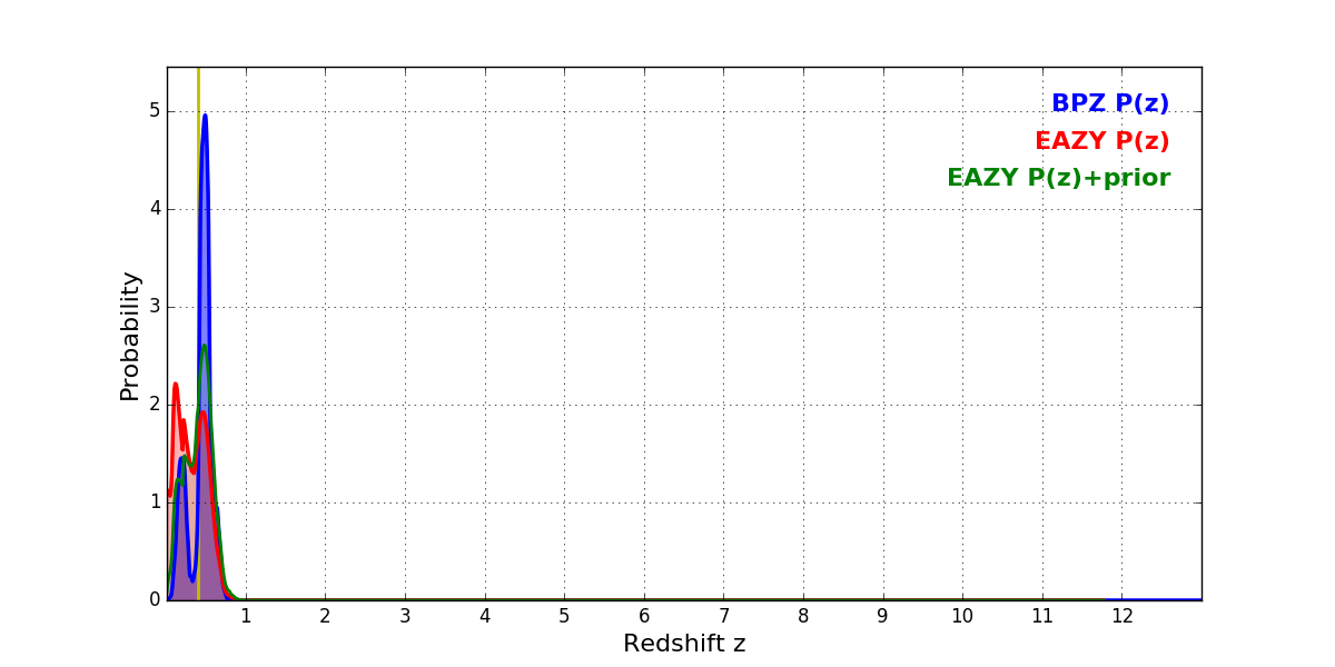 In P(z) plots: Yellow lines mark the cluster redshift z = 0.396,