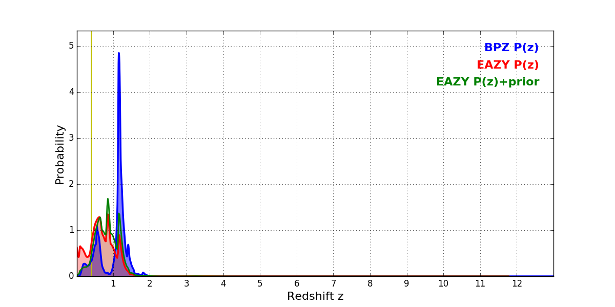 In P(z) plots: Yellow lines mark the cluster redshift z = 0.396,
