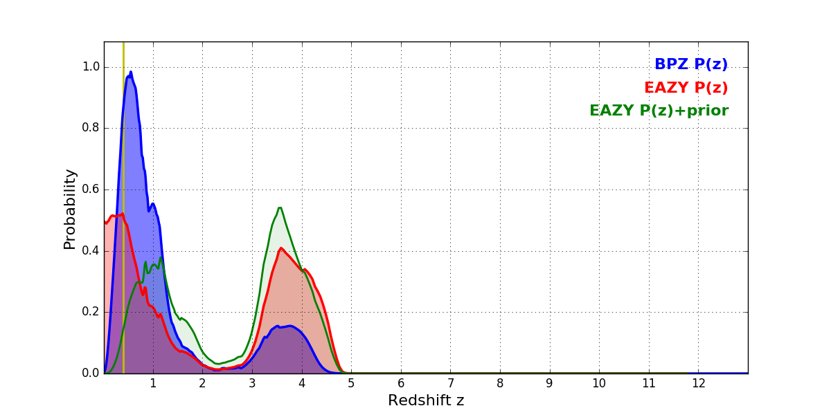 In P(z) plots: Yellow lines mark the cluster redshift z = 0.396,