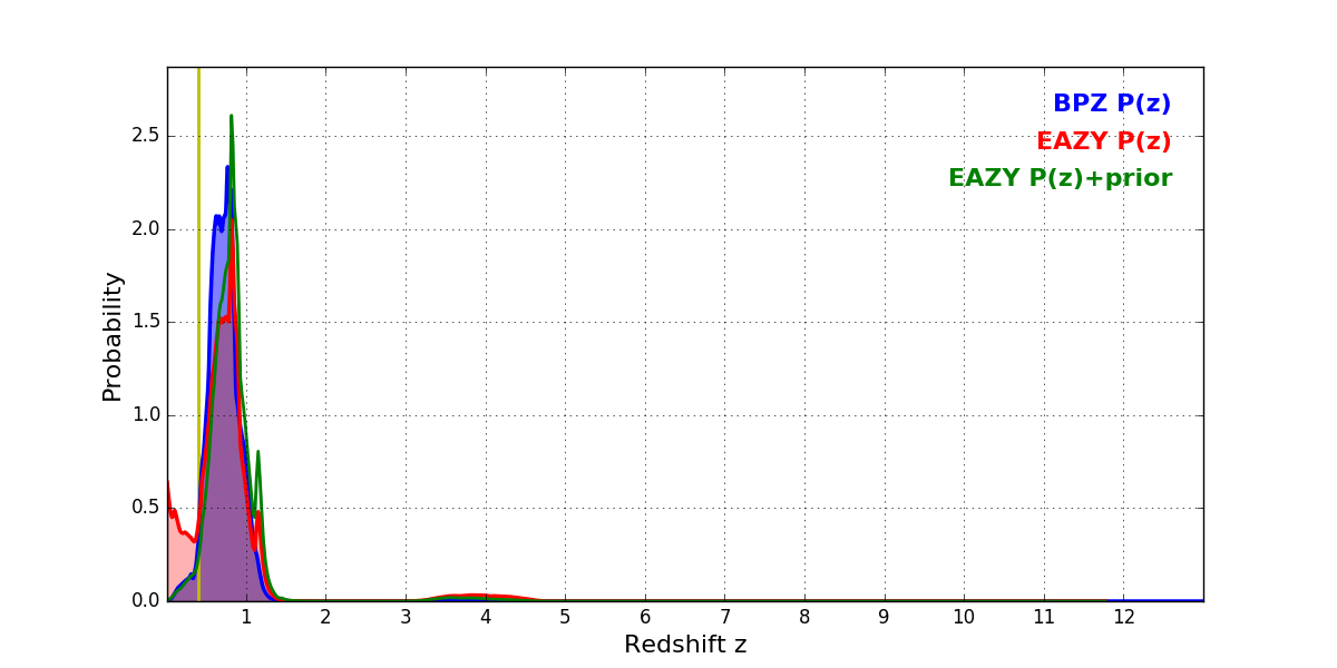 In P(z) plots: Yellow lines mark the cluster redshift z = 0.396,