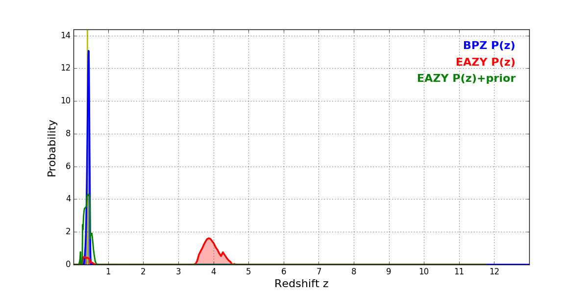 In P(z) plots: Yellow lines mark the cluster redshift z = 0.396,