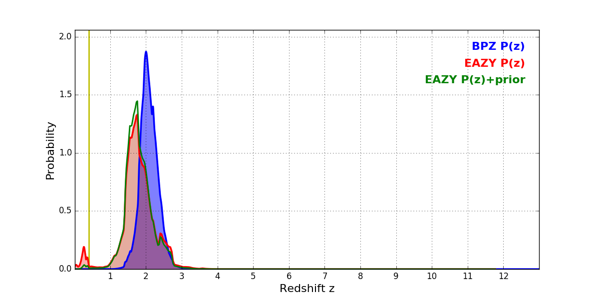 In P(z) plots: Yellow lines mark the cluster redshift z = 0.396,