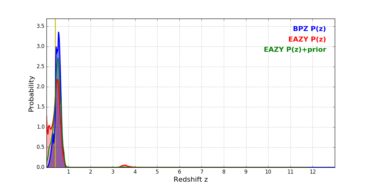 In P(z) plots: Yellow lines mark the cluster redshift z = 0.396,