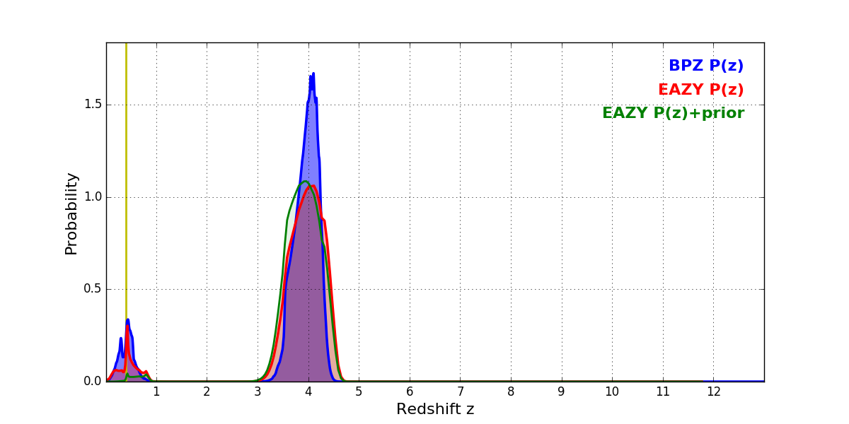 In P(z) plots: Yellow lines mark the cluster redshift z = 0.396,