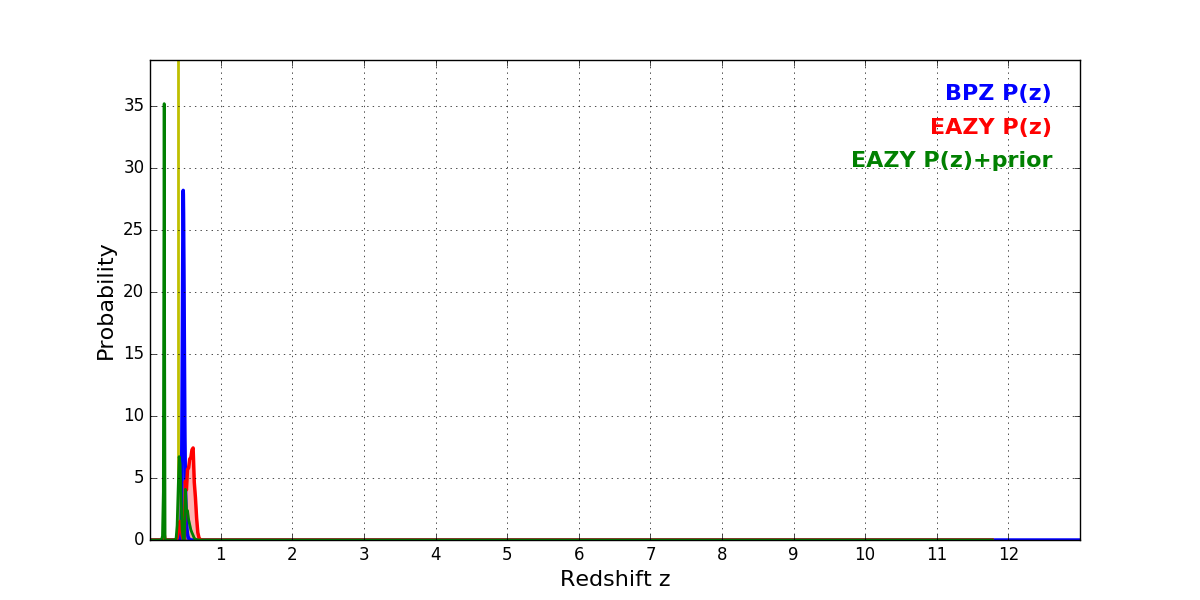 In P(z) plots: Yellow lines mark the cluster redshift z = 0.396,