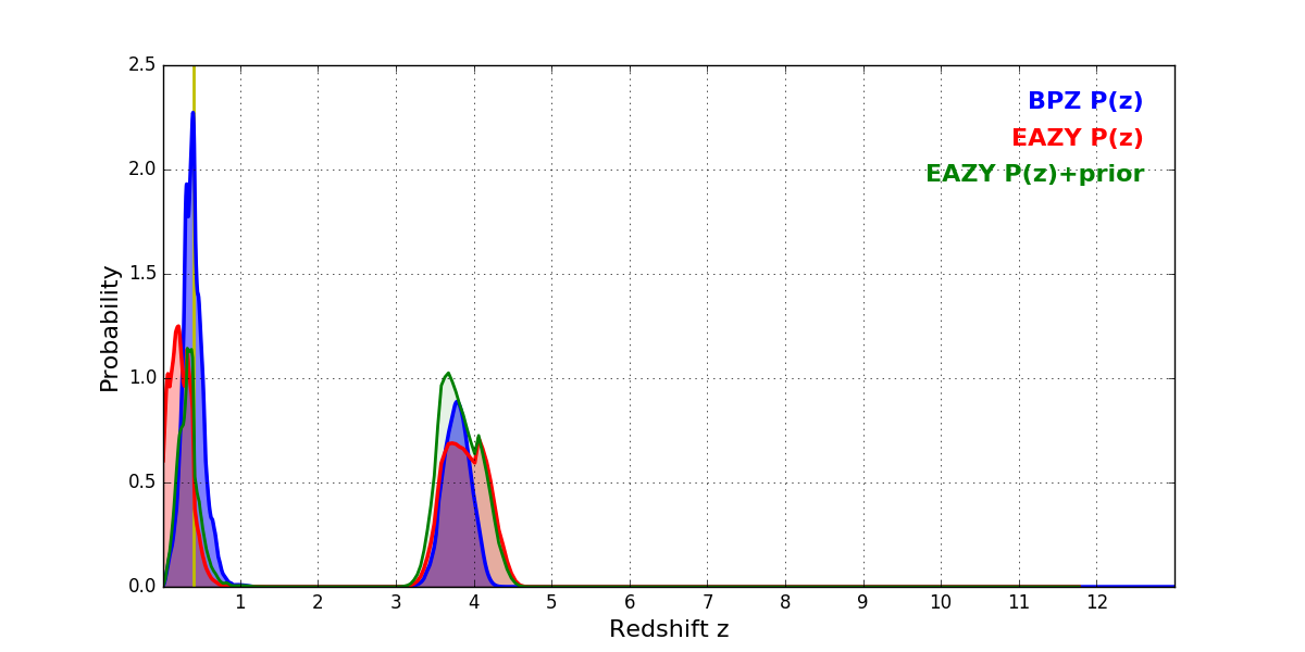 In P(z) plots: Yellow lines mark the cluster redshift z = 0.396,