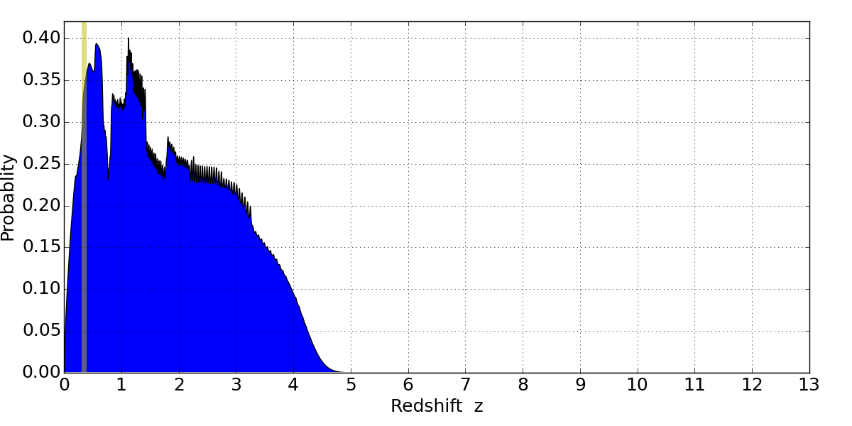 In P(z) plots: Yellow lines mark the cluster redshift z = 0.341,