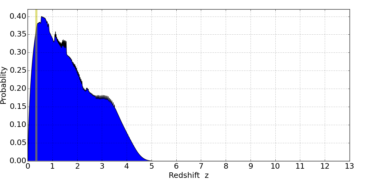 In P(z) plots: Yellow lines mark the cluster redshift z = 0.341,