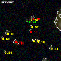 Object #450 x,y = (2693, 2919) RA, Dec = (01:43:16.944, 44:34:03.00) = (25.82060, 44.56750) BPZ = 0.593 [0.155--4.715] type = 9.40 (SB2_B10 - SB3_B10) chisq2 = 2.45 ODDS = 0.08 z_cluster = 0.341