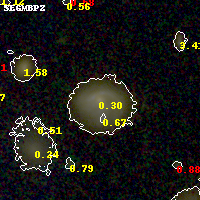 Object #721 x,y = (2899, 2611) RA, Dec = (01:43:15.792, 44:33:44.64) = (25.81580, 44.56240) BPZ = 0.303 [0.170--0.414] type = 3.00 (Ell5_A_0) chisq2 = 0.35 ODDS = 0.64 z_cluster = 0.341