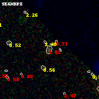 Object #78 x,y = (2873, 3609) RA, Dec = (01:43:15.936, 44:34:44.40) = (25.81640, 44.57900) BPZ = 0.817 [0.079--4.641] type = 8.60 (SB2_B10 - SB1_B10) chisq2 = 1.88 ODDS = 0.15 z_cluster = 0.341