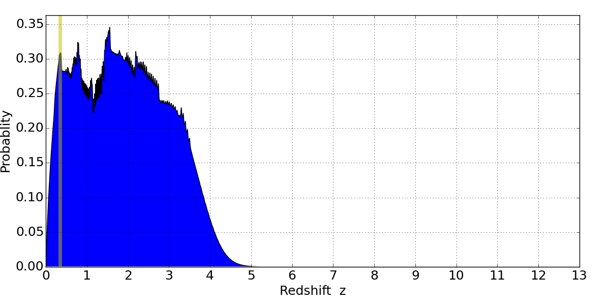 In P(z) plots: Yellow lines mark the cluster redshift z = 0.341,