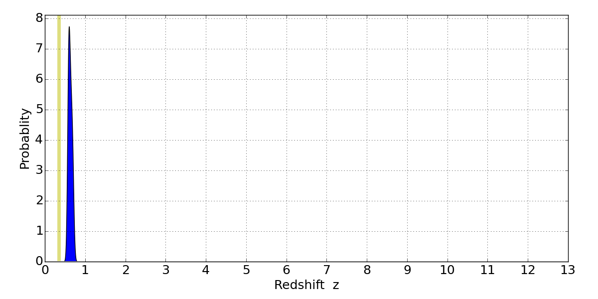 In P(z) plots: Yellow lines mark the cluster redshift z = 0.341,
