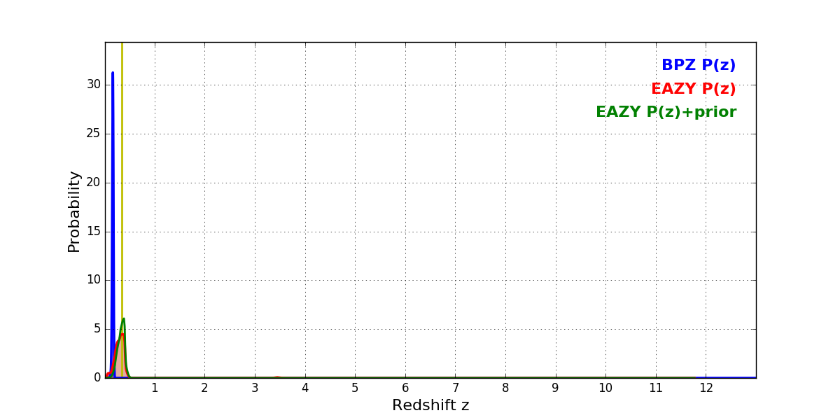 In P(z) plots: Yellow lines mark the cluster redshift z = 0.341,