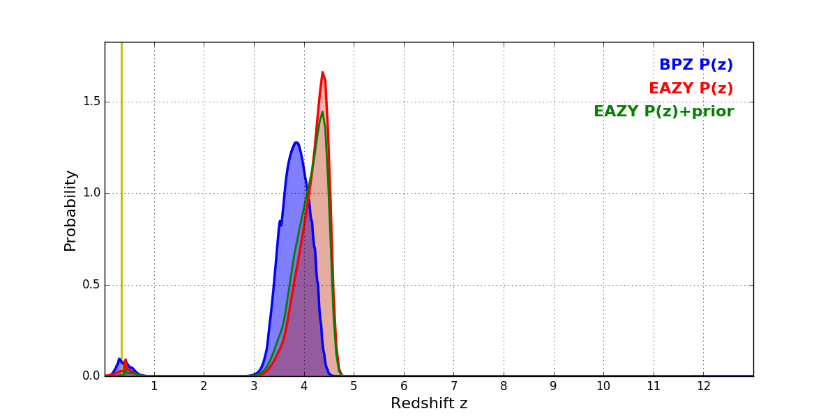 In P(z) plots: Yellow lines mark the cluster redshift z = 0.341,