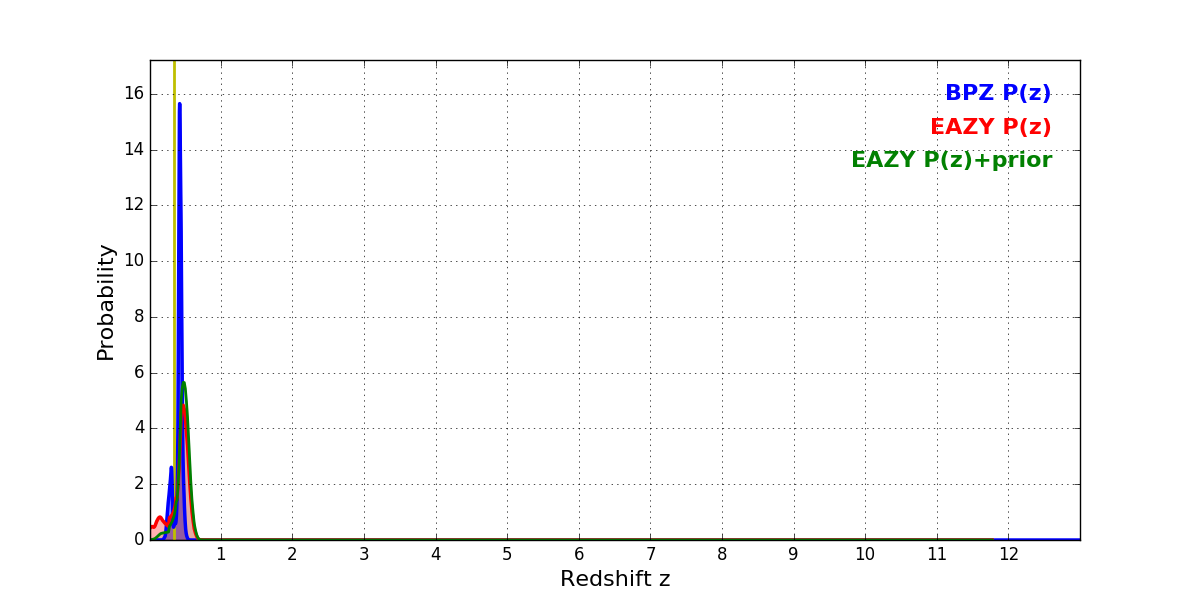 In P(z) plots: Yellow lines mark the cluster redshift z = 0.341,
