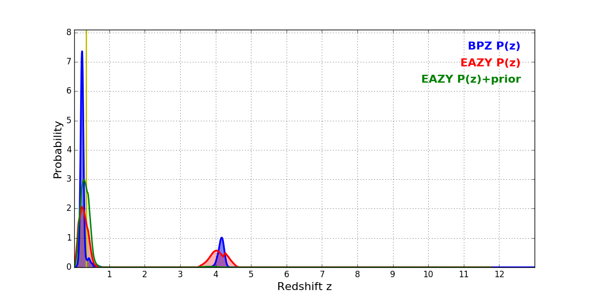 In P(z) plots: Yellow lines mark the cluster redshift z = 0.341,
