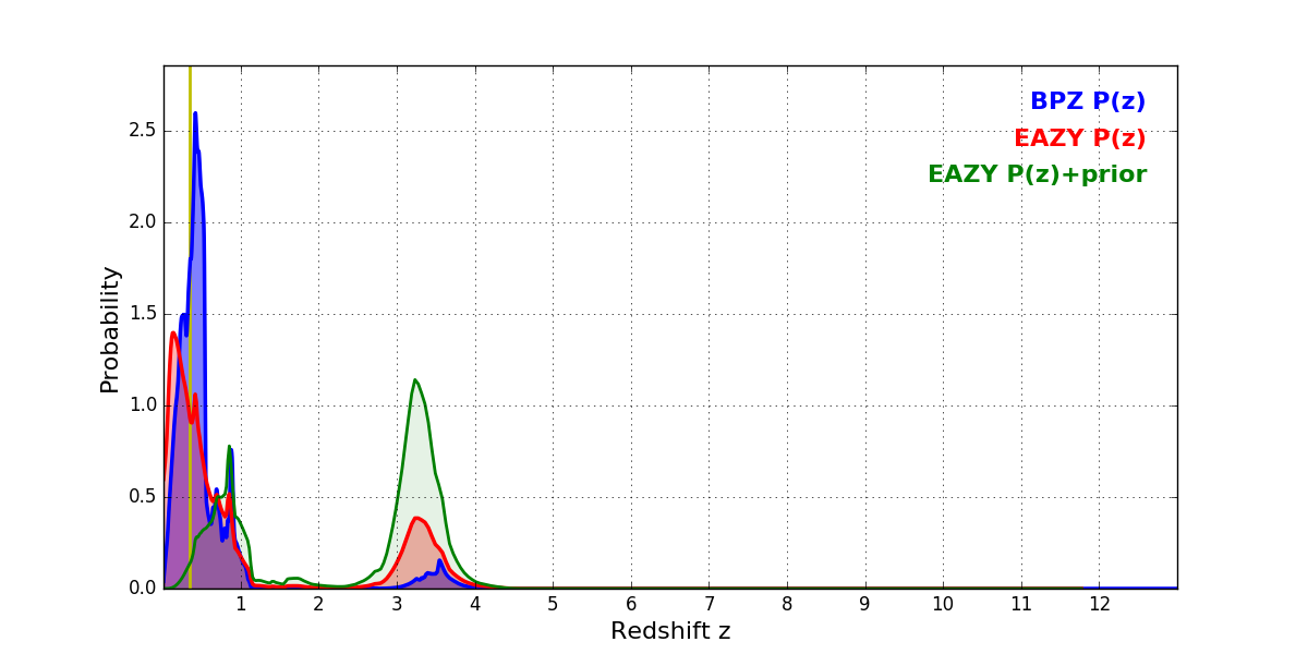 In P(z) plots: Yellow lines mark the cluster redshift z = 0.341,