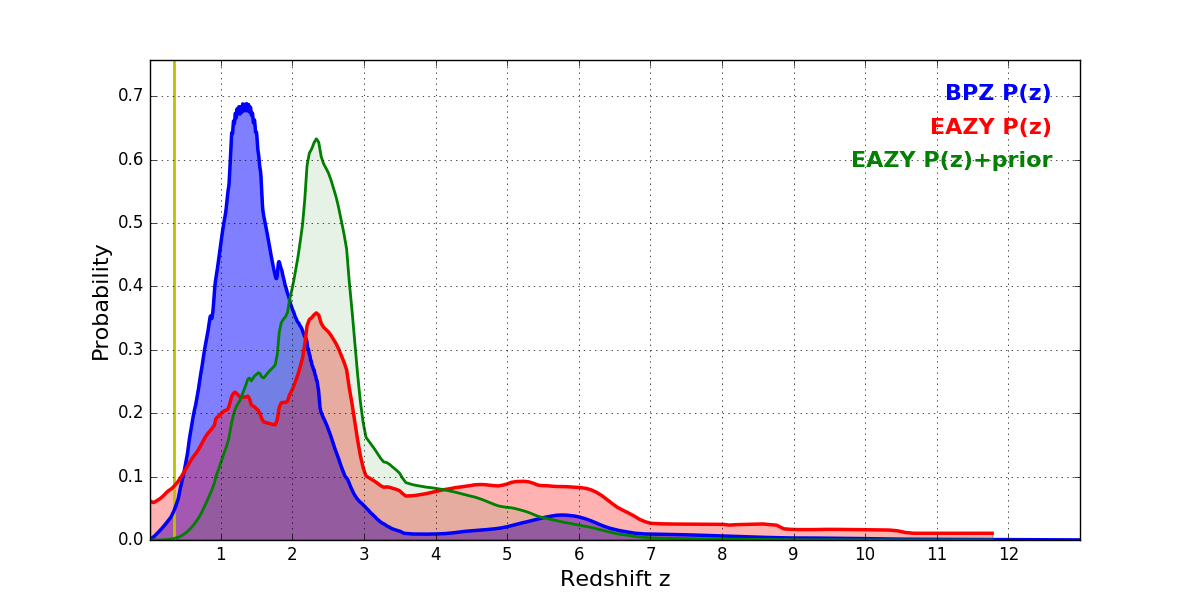 In P(z) plots: Yellow lines mark the cluster redshift z = 0.341,