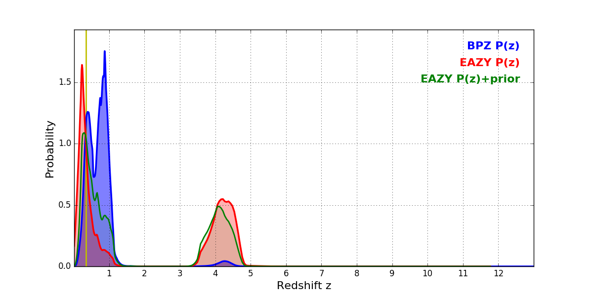 In P(z) plots: Yellow lines mark the cluster redshift z = 0.341,