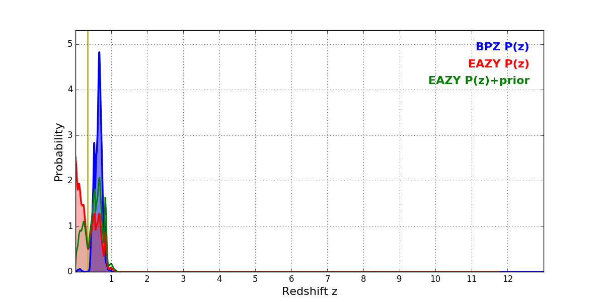 In P(z) plots: Yellow lines mark the cluster redshift z = 0.341,