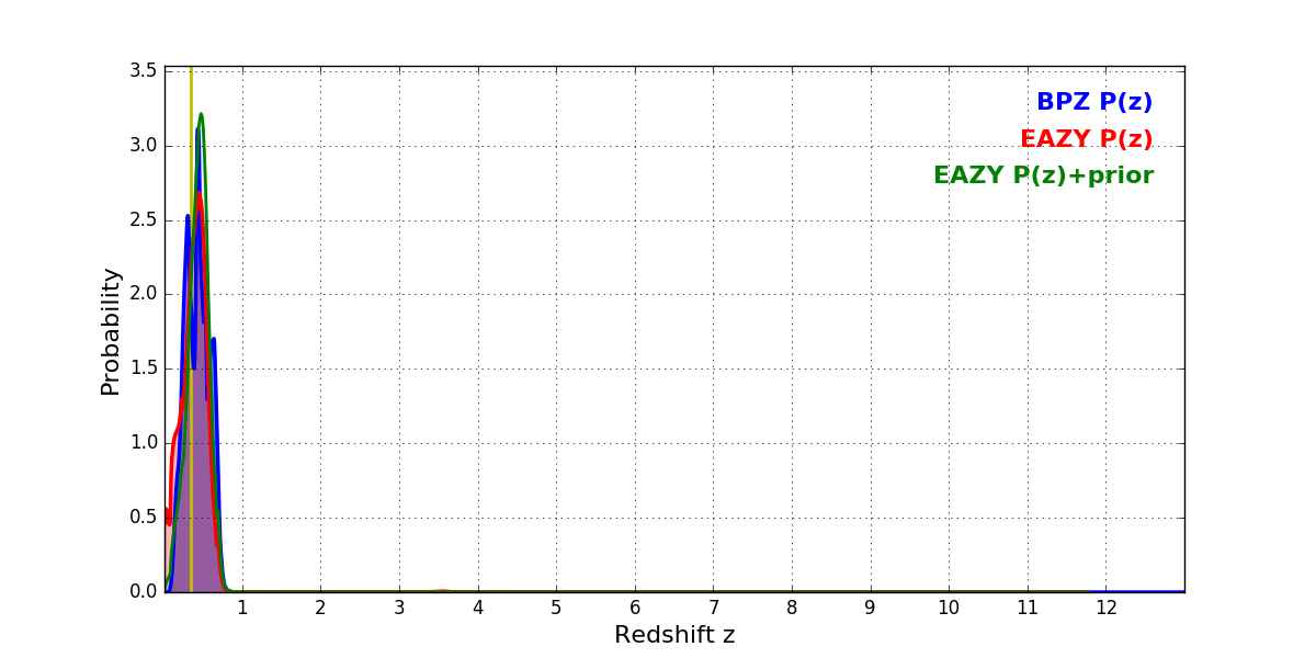 In P(z) plots: Yellow lines mark the cluster redshift z = 0.341,