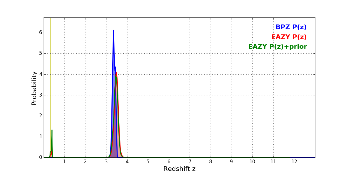 In P(z) plots: Yellow lines mark the cluster redshift z = 0.341,