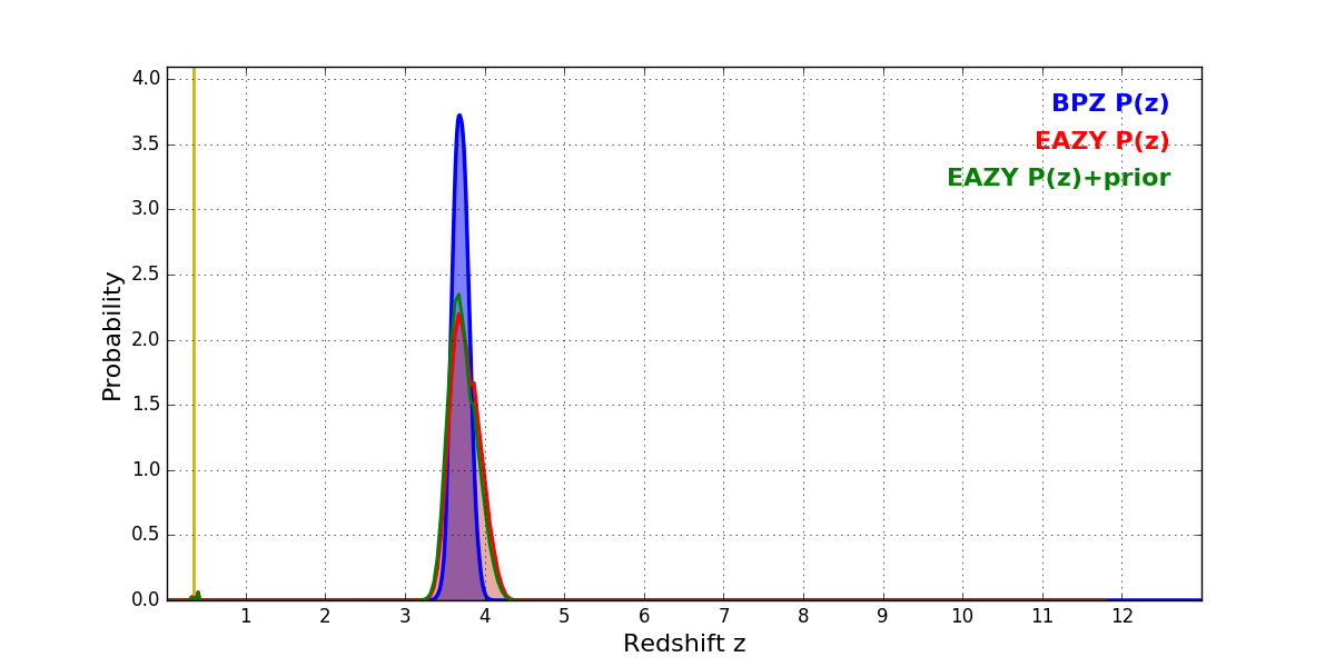 In P(z) plots: Yellow lines mark the cluster redshift z = 0.341,