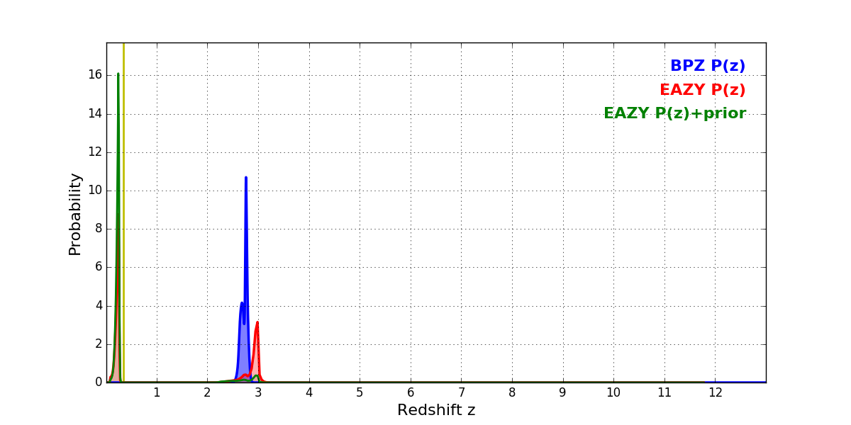In P(z) plots: Yellow lines mark the cluster redshift z = 0.341,