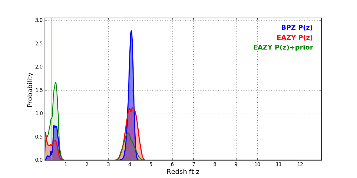 In P(z) plots: Yellow lines mark the cluster redshift z = 0.341,
