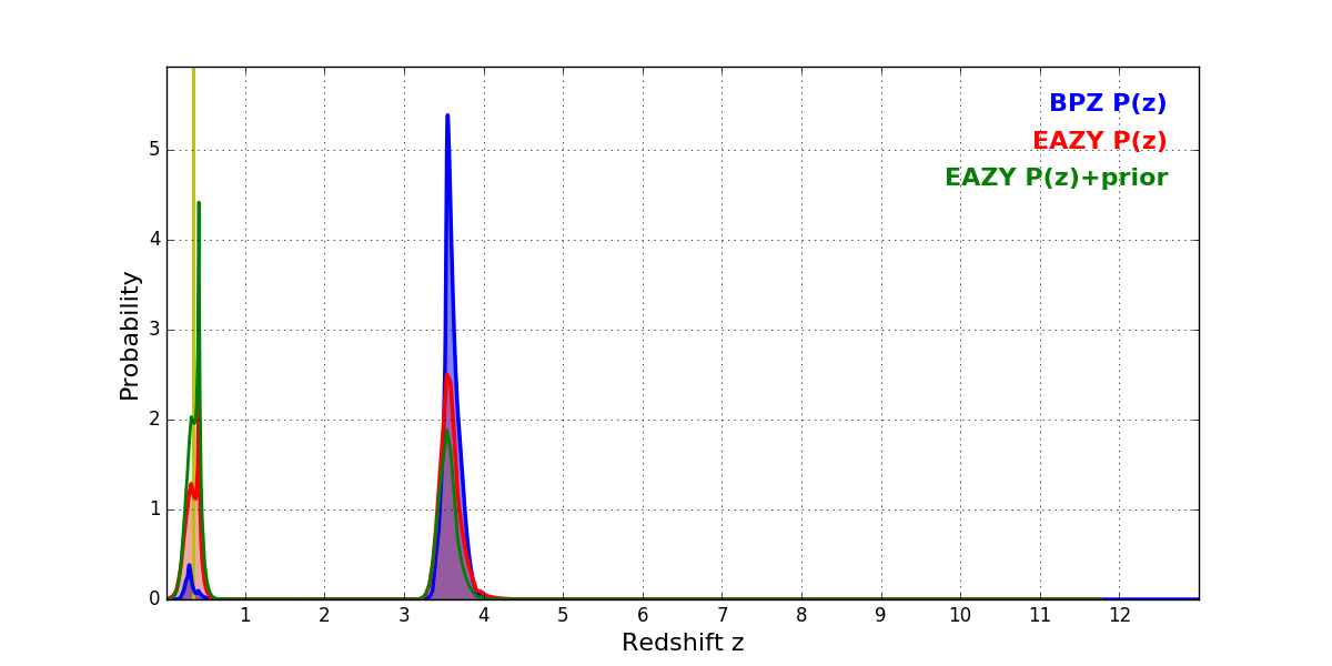 In P(z) plots: Yellow lines mark the cluster redshift z = 0.341,