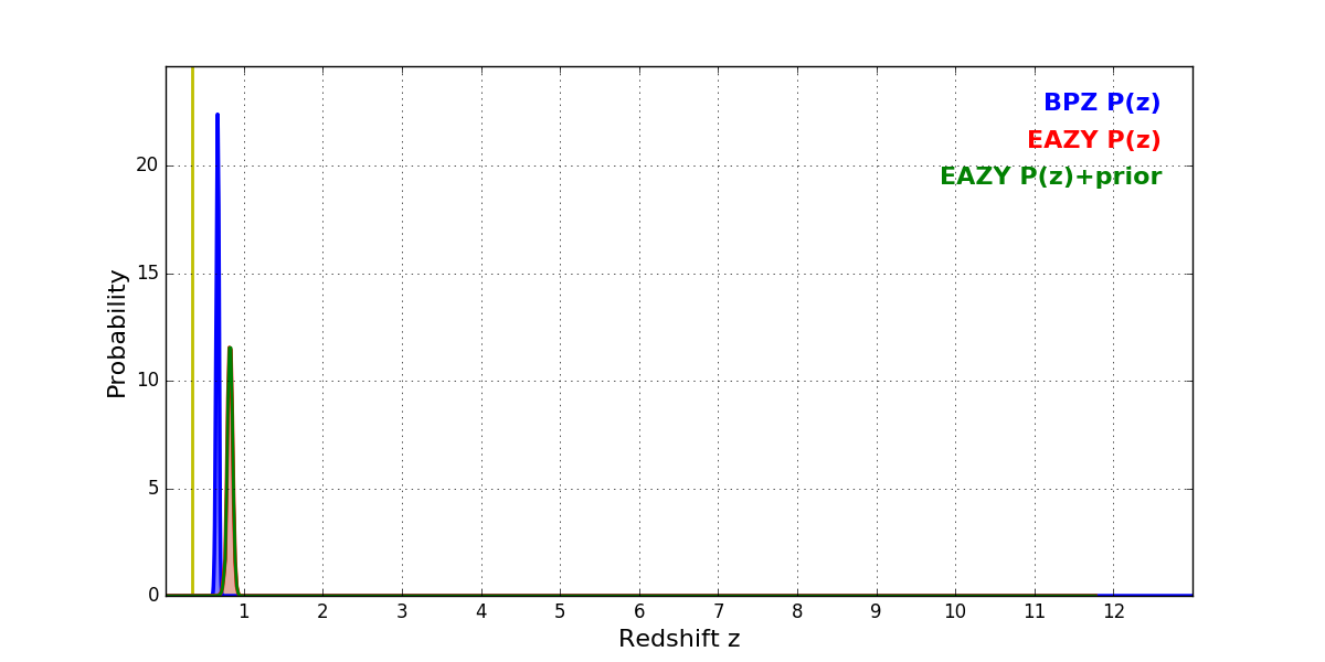 In P(z) plots: Yellow lines mark the cluster redshift z = 0.341,