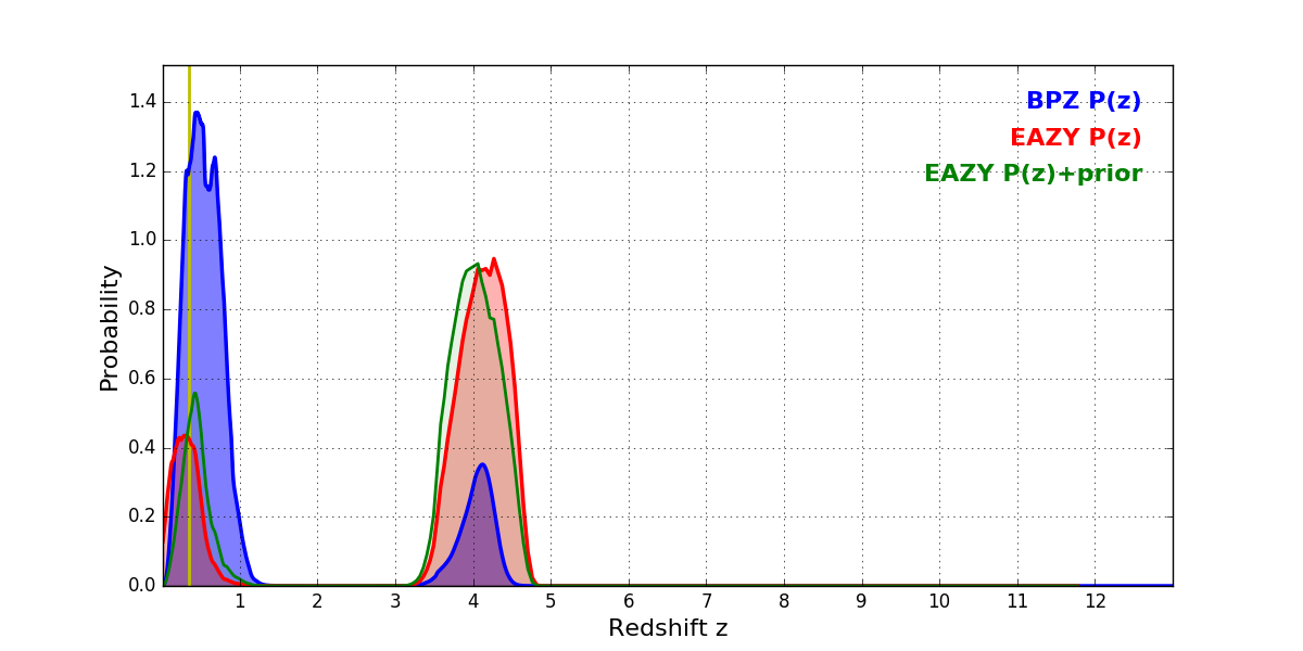 In P(z) plots: Yellow lines mark the cluster redshift z = 0.341,
