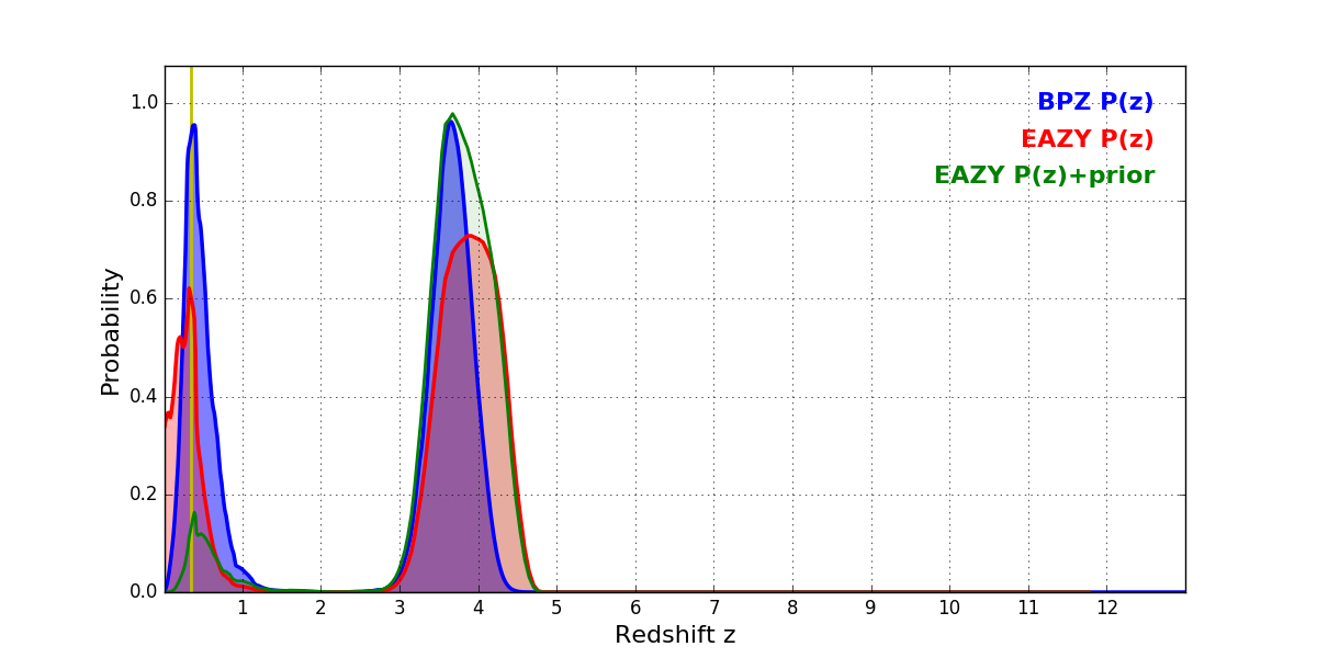 In P(z) plots: Yellow lines mark the cluster redshift z = 0.341,