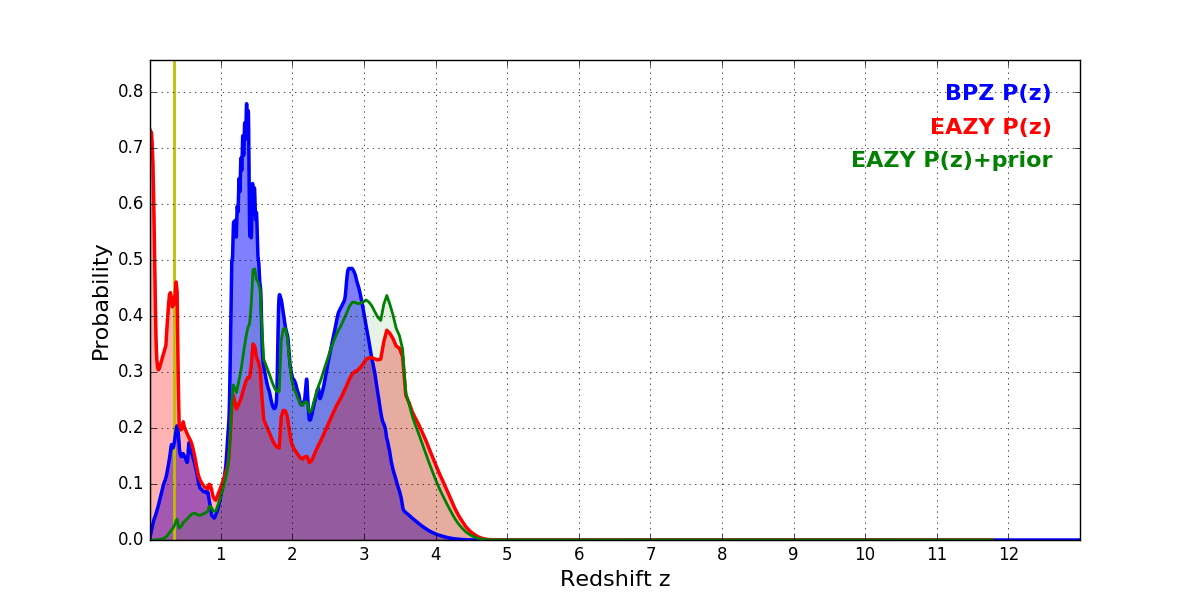 In P(z) plots: Yellow lines mark the cluster redshift z = 0.341,
